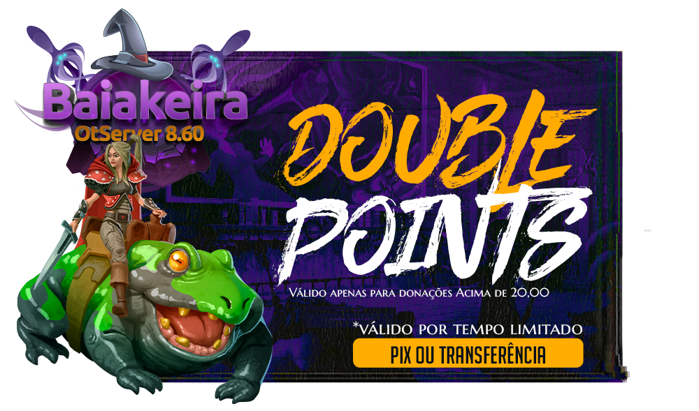 [TRIPLO POINTS] Estamos com promoo vlida somente at hoje 23:59, donate acima de 20,00 ganha 2x, acima de 50,00 ganha 3x e acima de 100,00 ganha 3x + um bonus de 50 pontos. Pagamento apenas em pix ou transferncia (pagamento em pagseguro ser promoo normal (double acima de 30,00)